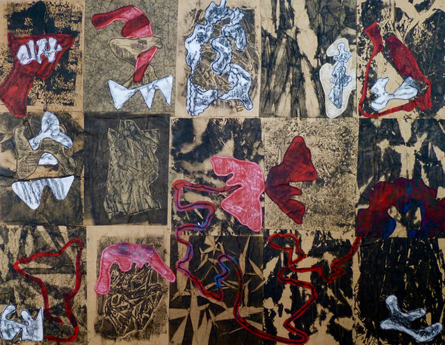 Collage de dessins et monotypes sur kraft marouflé sur bois